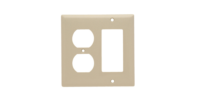 This 2-Gang Wall Plate Provides Openings For 1-Duplex Receptacle and 1-Decorator Device
